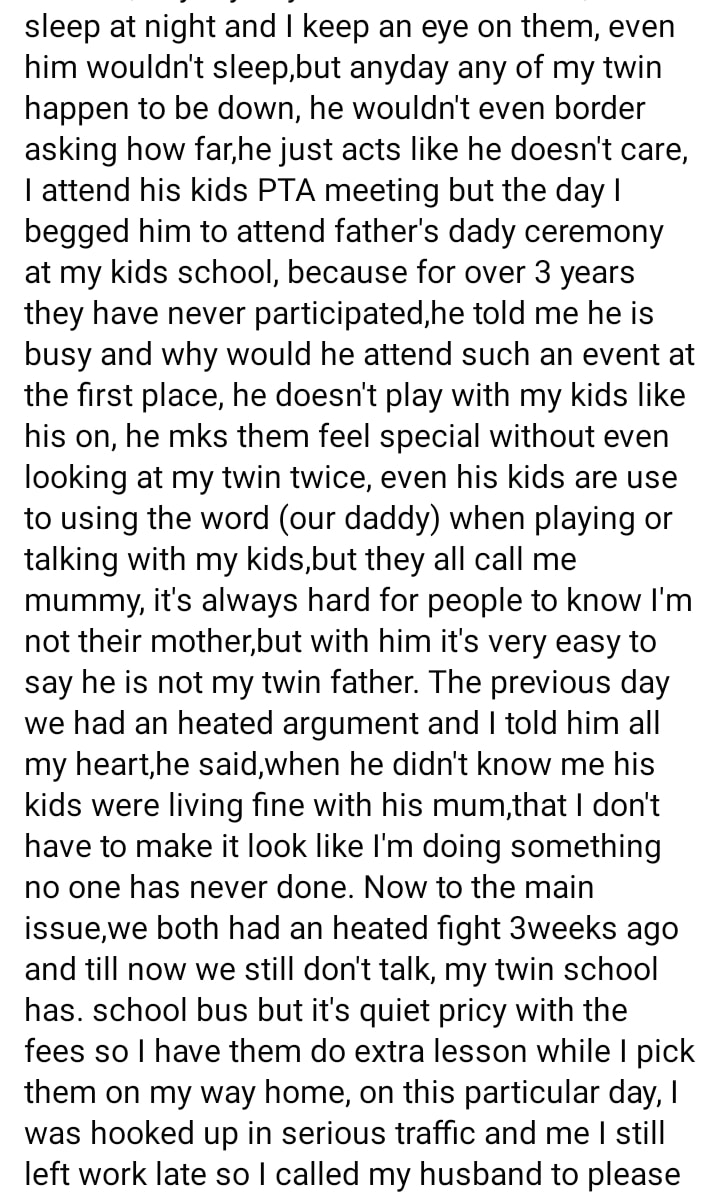 Anyday any of his kids are sick ,I don’t sleep at night and I keep an eye on them, even him wouldn’t sleep,but anyday any of my twin happen to be down, he wouldn’t even border asking how far,he just acts like he doesn’t care, I attend his kids PTA meeting but the day I begged him to attend father’s dady ceremony at my kids school, because for over 3 years they have never participated,he told me he is busy and why would he attend such an event at the first place, he doesn’t play with my kids like his on, he mks them feel special without even looking at my twin twice, even his kids are use to using the word (our daddy) when playing or talking with my kids,but they all call me mummy, it’s always hard for people to know I’m not their mother,but with him it’s very easy to say he is not my twin father.