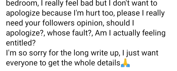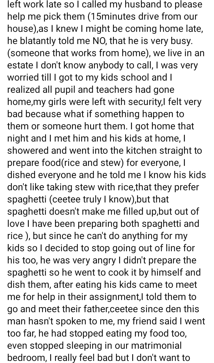 I got home that night and I met him and his kids at home, I showered and went into the kitchen straight to prepare food(rice and stew) for everyone, I dished everyone and he told me I know his kids don’t like taking stew with rice,that they prefer spaghetti (ceetee truly I know),but that spaghetti doesn’t make me filled up,but out of love I have been preparing both spaghetti and rice ), but since he can’t do anything for my kids so I decided to stop going out of line for his too, he was very angry I didn’t prepare the spaghetti so he went to cook it by himself and dish them, after eating his kids came to meet me for help in their assignment,I told them to go and meet their father,ceetee since den this man hasn’t spoken to me, my friend said I went too far, he had stopped eating my food too, even stopped sleeping in our matrimonial bedroom, I really feel bad but I don’t want to apologize because I’m hurt too, please I really need your followers opinion, should I apologize?, whose fault?, Am I actually feeling entitled?