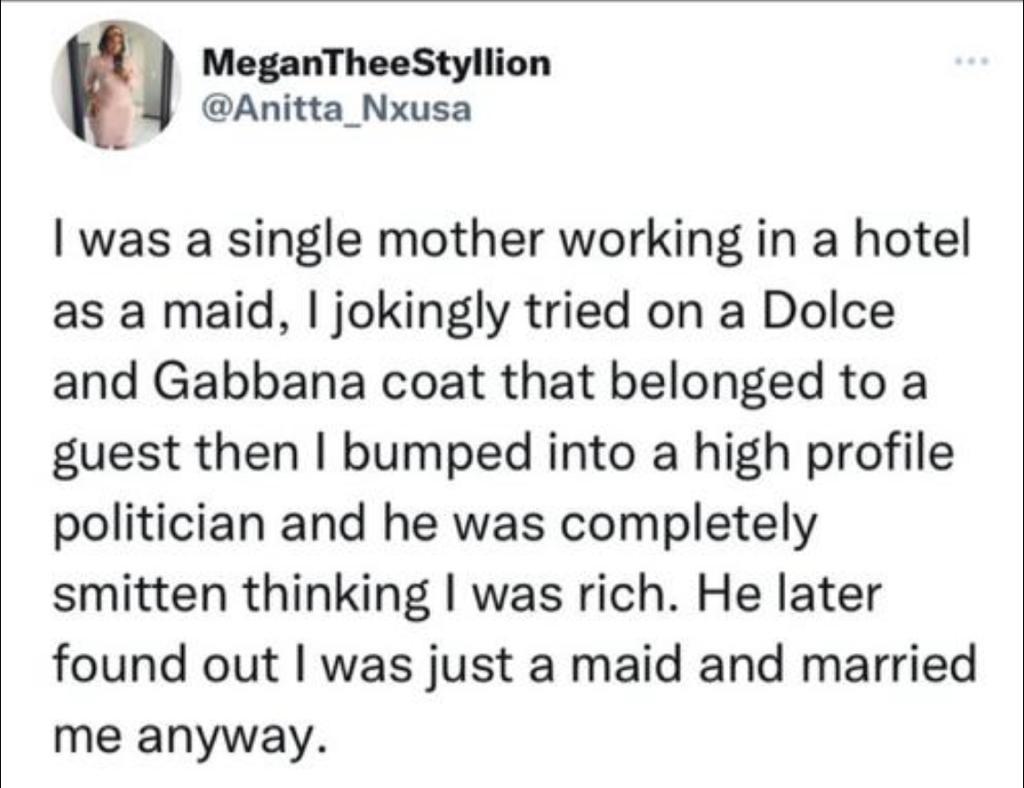 “I was a single mother working in a hotel as a maid, I jokingly tried on a Dolce and Gabbana coat that belonged to a guest then I bumped into a high-profile politician and he was completely smitten thinking I was rich. He later found out I was just a maid and married me anyway.”