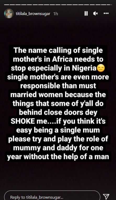 In a message uploaded on her Instagram stories, the single mother of one demanded that the shaming of single mothers in Africa, particularly in Nigeria, end.