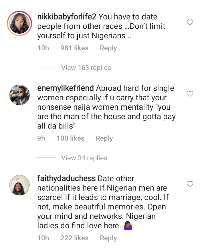 faithydaduchess wrote: “Date other nationalities here if Nigerian men are scarce! If it leads to marriage, cool. If not, make beautiful memories. Open your mind and networks. Nigerian ladies do find love here.”