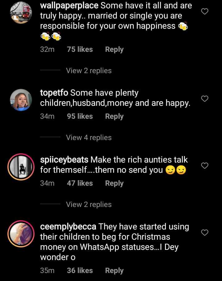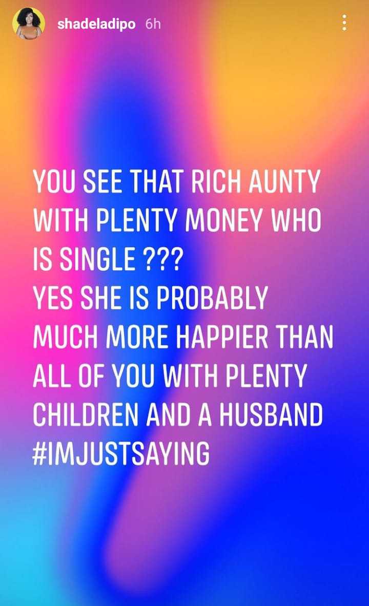 She wrote: “You see that rich aunty with plenty money and is single? Yes she is probably more happier than all of you with plenty children and a husband #imjustsaying.”
