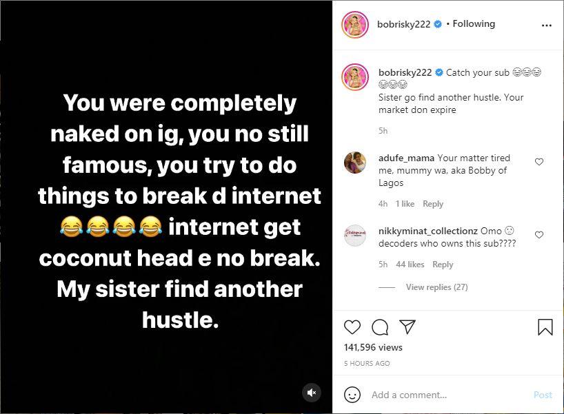 “You were completely naked on IG, you no still famous, you try to break the internet, internet get coconut head e no break.