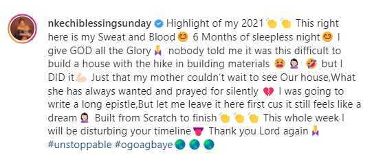 “Highlight of my 2021?? This right here is my Sweat and Blood? 6 Months of sleepless night? I give GOD all the Glory? nobody told me it was this difficult to build a house with the hike in building materials ???♀️ ? but I DID it?? Just that my mother couldn’t wait to see Our house,What she has always wanted and prayed for silently ? I was going to write a long epistle,But let me leave it here first cus it still feels like a dream??♀️ Built from Scratch to finish??? This whole week I will be disturbing your timeline? Thank you Lord again?,” she wrote.