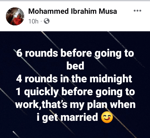 The man who goes by the name Mohammed Ibrahim Musa took to a Facebook forum to reveal the number of times he intends to copulate with his future wife.