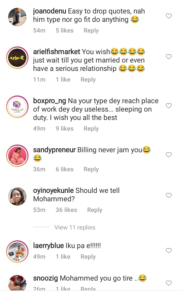 sir_efex wrote: “…….. should we tell him? Until you marry, na em you go know say DOKING na work and na 12 units course “