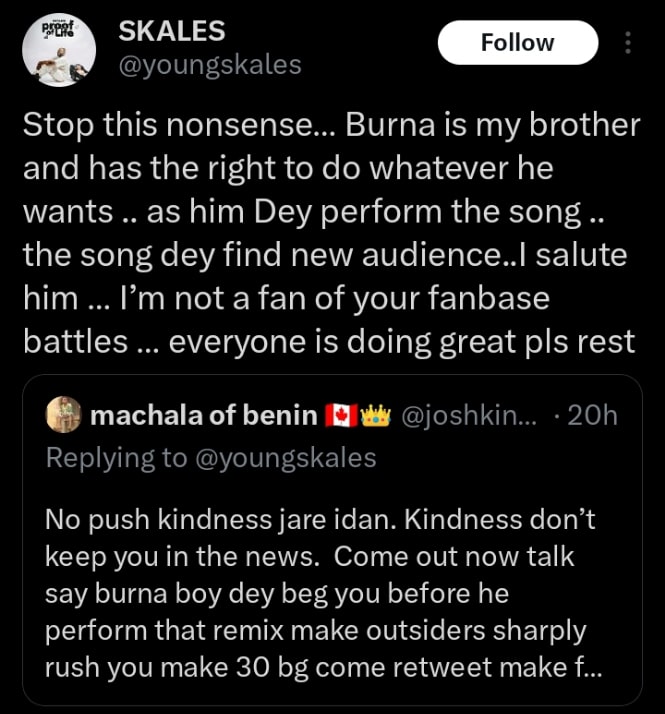 In his words: “Stop this nonsense… Burna is my brother and has the right to do whatever he wants .. as him Dey perform the song .. the song dey find new audience..I salute him … I’m not a fan of your fanbase battles … everyone is doing great pls rest”