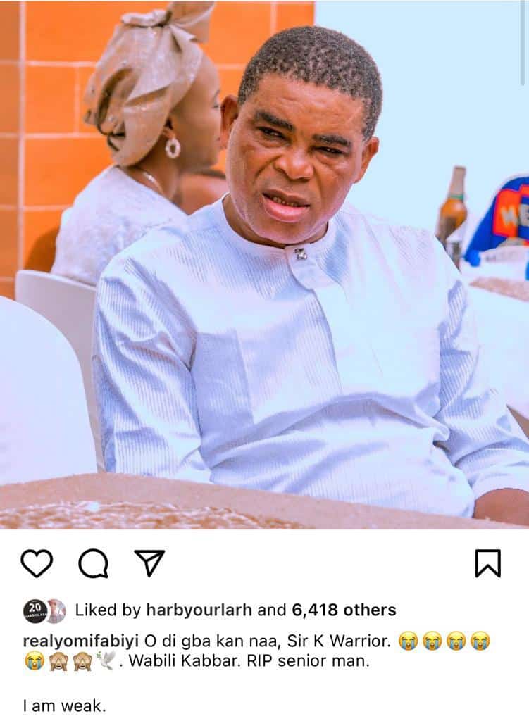 “O di gba kan naa, sir K warrior. *cying emoji* Wabili Kabbar. RIP senior man. I am weak”