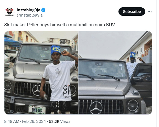 Tongues wag as Nigerian skit maker, Peller reportedly buys himself a multimillion naira Mercedes Benz SUV.