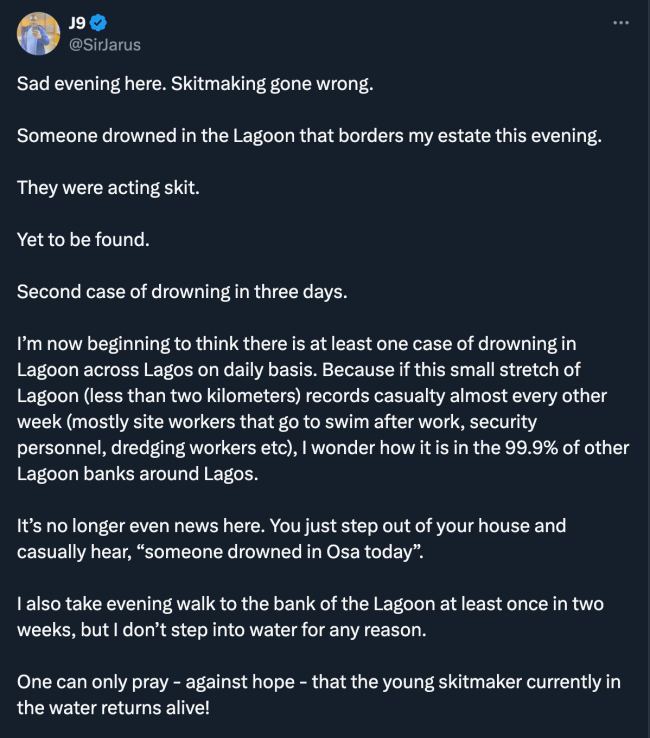 “Sad evening here. Skitmaking gone wrong. Someone drowned in the Lagoon that borders my estate this evening. They were acting skit. Yet to be found.”