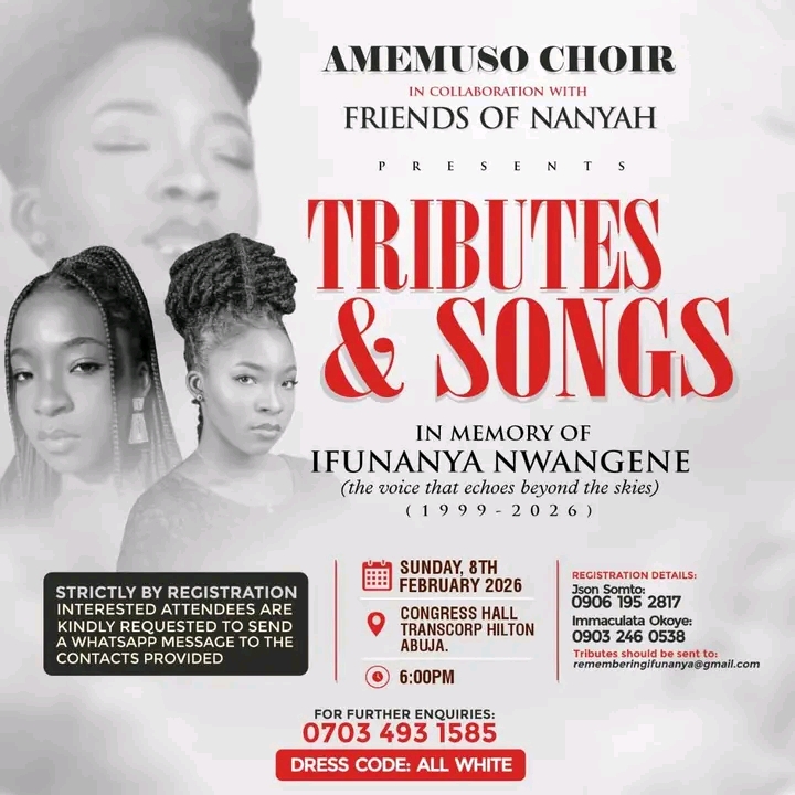 The Abuja Metropolitan Music Society (AMEMUSO) choir, which the singer belonged to, announced the tribute via Facebook and called for registration.