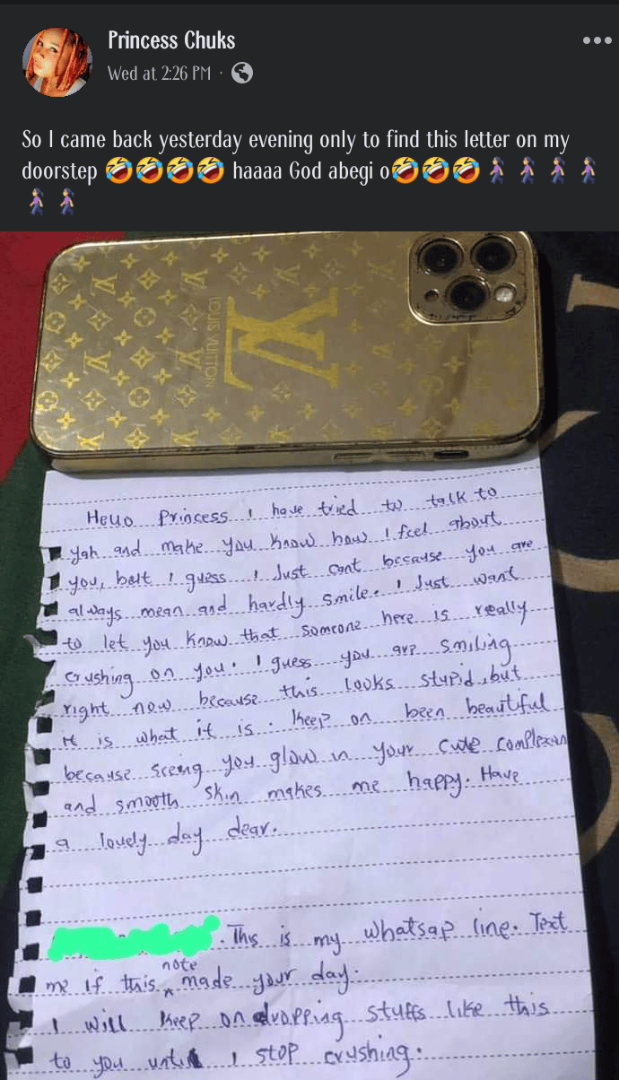 A beautiful lady identifed as Princess Chuks shared a handwritten love note which a secret admirer dropped on her doorstep.