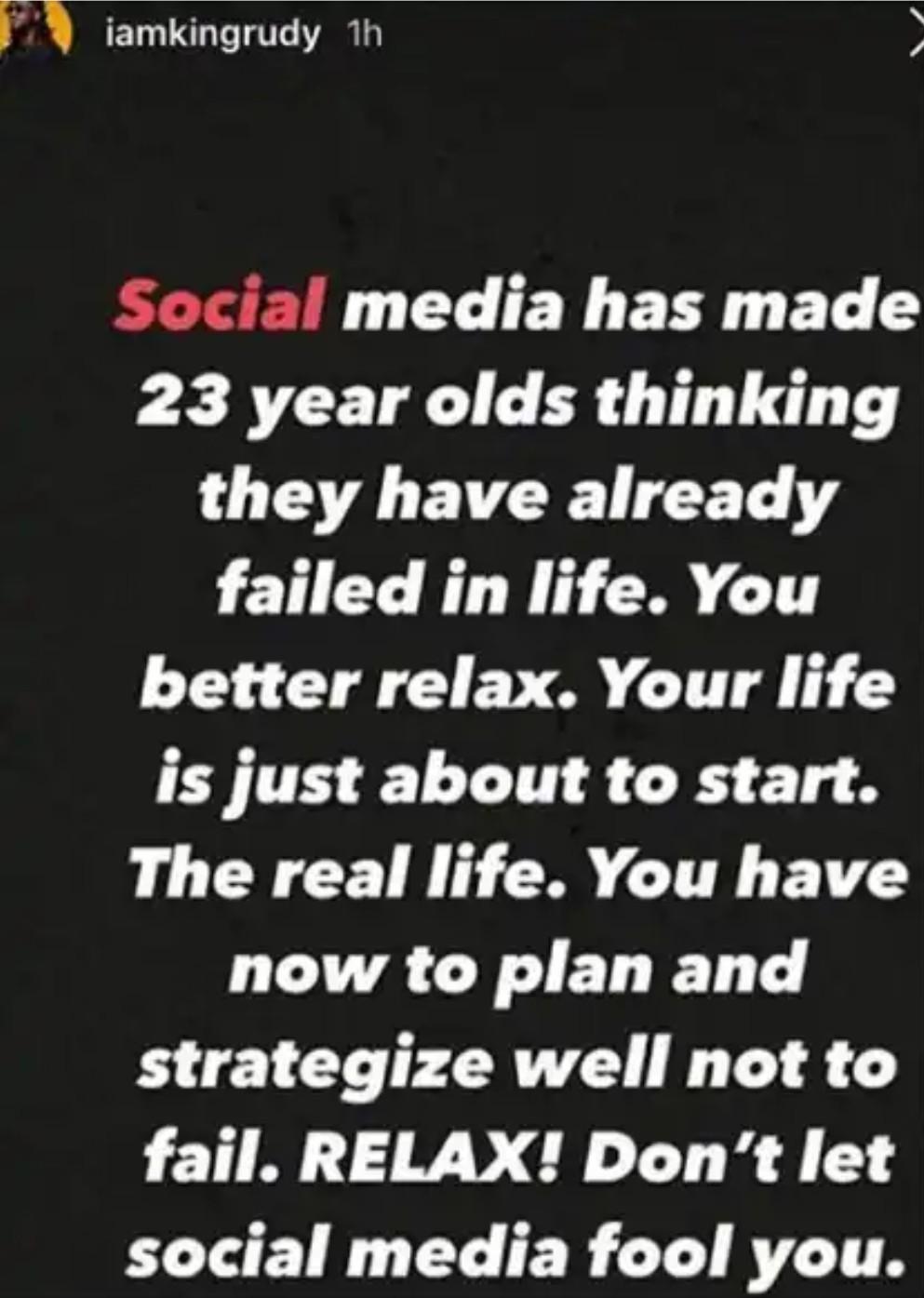In a recent post which he shared on his Instagram page, the father of three said social media has made 23 year old people think they have already failed in life.