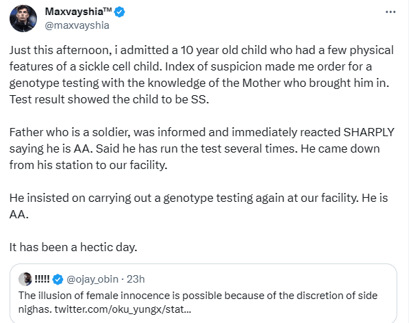 A Nigerian doctor has recounted how a Nigerian soldier found out that his wife committed paternity fraud after their 10-year-old son suffered a medical emergency.