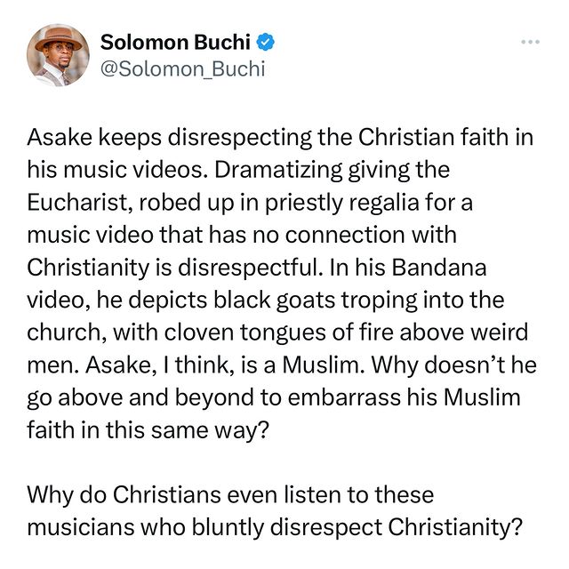 “Asake keeps disrespecting the Christian faith in his music videos. Dramatizing giving the Eucharist, robed up in priestly regalia for a music video that has no connection with Christianity is disrespectful.