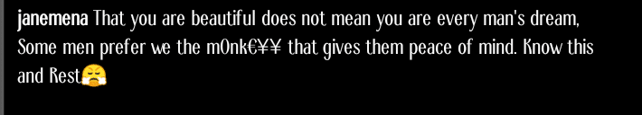 “That you’re beautiful doesn’t mean that you’re every man’s dream, some men prefer we the monkey that gives them peace of mind. Know this and rest.”