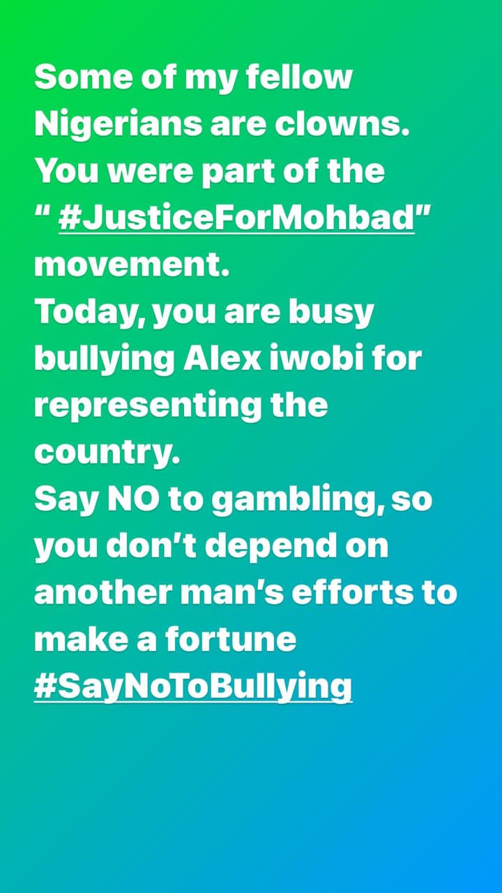 His words: “Some of my fellow Nigerians are clowns. You were part of the “#JusticeForMohbad” movement. Today, you are busy bullying Alex iwobi for representing the country. Say NO to gambling, so you don’t depend on another man’s efforts to make a fortune #SayNoToBullying.”