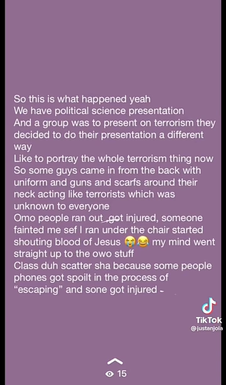 “Some people fainted; I ran under a chair” – Lady recounts how students mistook presentation for bandit attack (Video)
