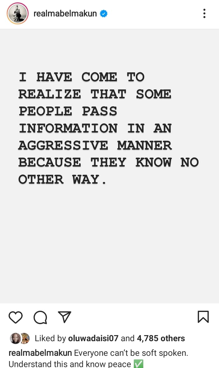 While reacting to his manner of delivery in the podcast, Mabel Makun said in a post on her Instagram page that most people pass information in an aggressive manner because that is the only way they know.