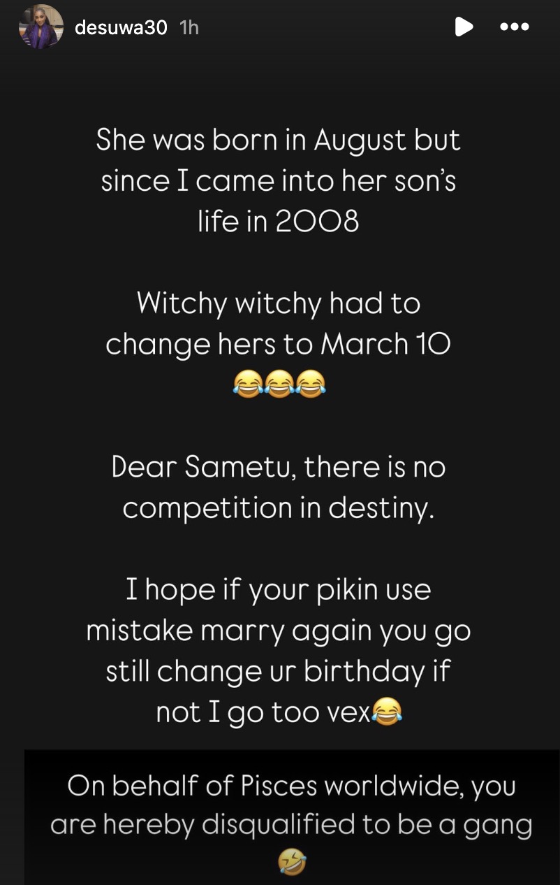 She continued, “She was born in August but since I came into her son’s life in 2008. Witchy witchy had to change hers to March 10. Dear Sametu, there is no competition in destiny. I hope if your pikin use mistake marry again you go still change ur birthday if not I go too vex. On behalf of Pisces worldwide, you are hereby disqualified to be a gang.”