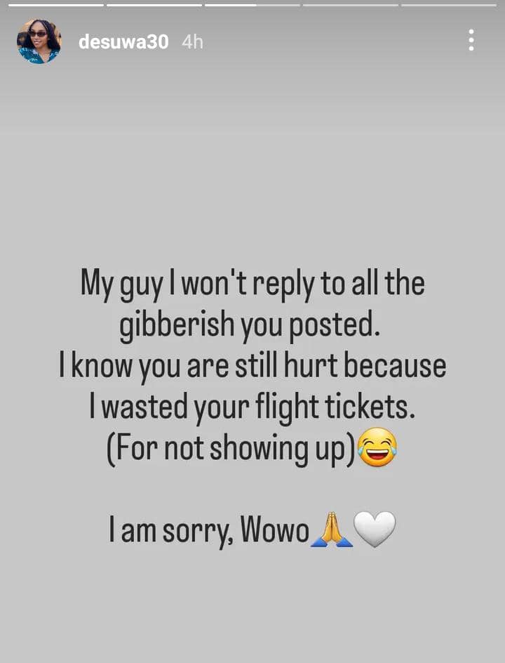 She wrote: “My guy I won’t reply to all the gibberish you posted. I know you are still hurt because I wasted your flight tickets. (For not showing up) I am sorry, Wowo.