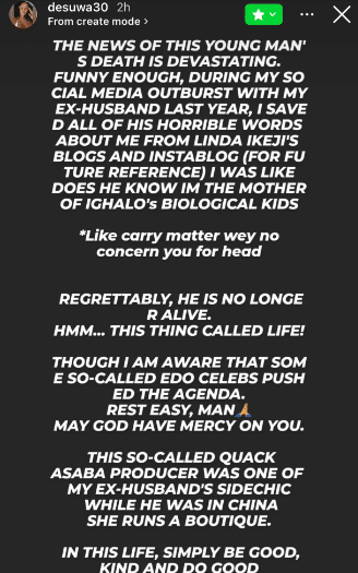 The socialite make the claim in a post on her Instagram page while reacting to the news of the unfortunate demise of the Nollywood actor, Junior Pope.