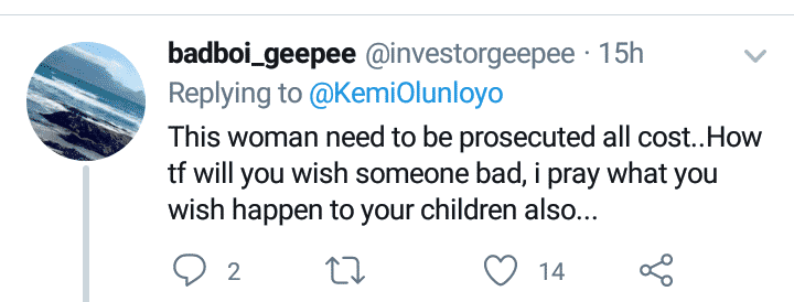 Meanwhile, some Nigerians on the Twitter app have taken to the reply section to drag her for wishing Davido evil.