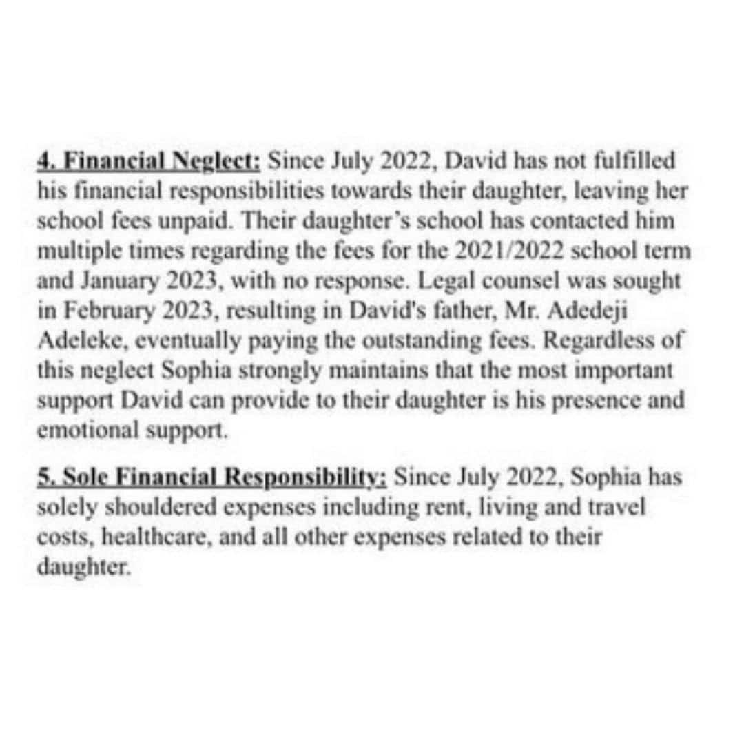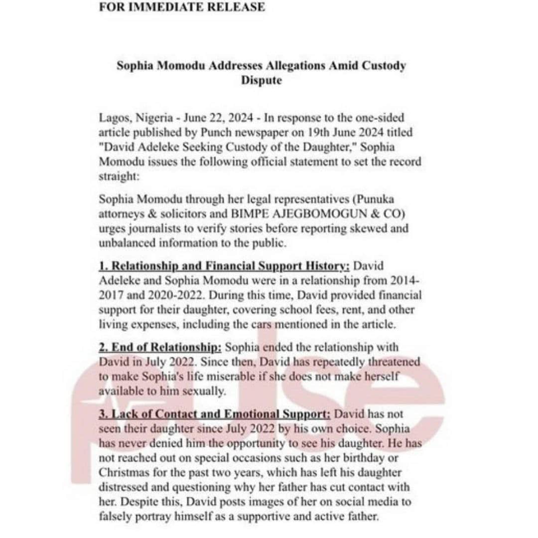 In response, Sophia stated that she had an affair with Davido from 2020-2022 while he was dating Chioma. She denied the claims of denying him access to their daughter, Imade, revealing that Davido had never attempted to see her and had abandoned her because she refused to have sex with him.