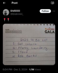Identifying himself as Didi, the man listed “sell cocaine,” “rob a bank,” “do yahoo,” and “money laundering” as his goals for 2024.