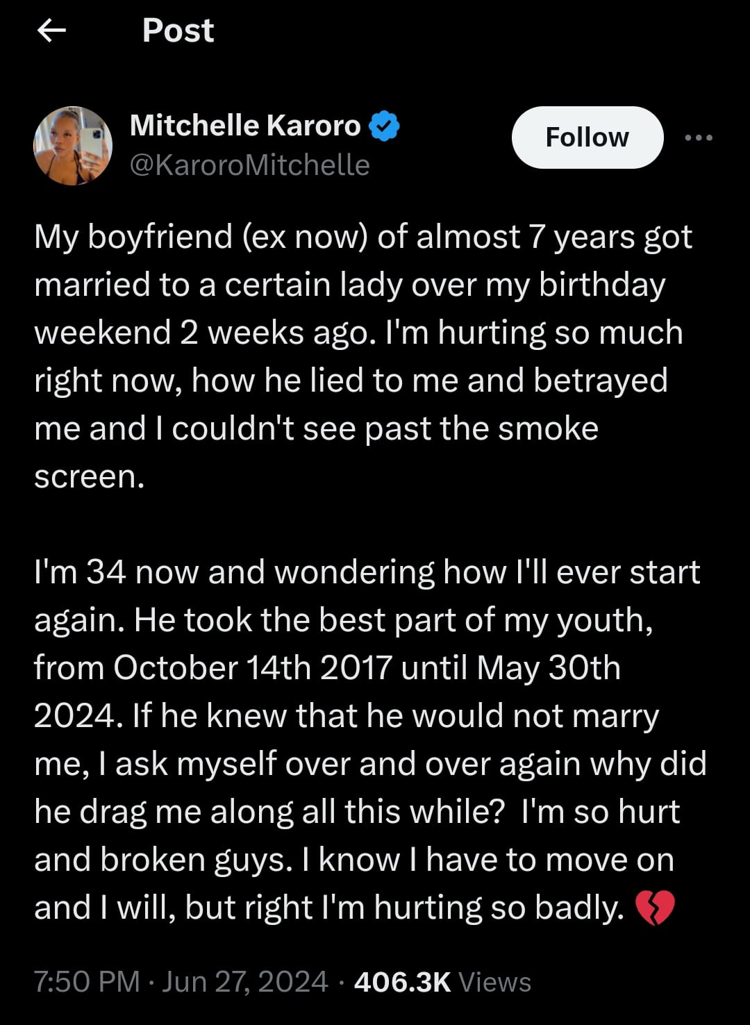“I’m 34 now and wondering how I’ll ever start again. He took the best part of my youth, from October 14th, 2017 until May 30th, 2024. If he knew that he would not marry me, I ask myself over and over again why did he drag me along all this while? I’m so hurt and broken, guys. I know I have to move on, and I will, but right now I’m hurting so badly.”