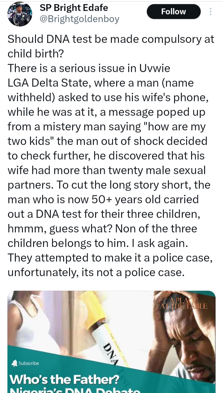 SP Bright Edafe shared: “Should DNA test be made compulsory at child birth?