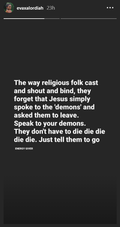 Nigerian rapper and Eva Alordiah has urged religious folks to speak to their demons, that they don’t always have to die.