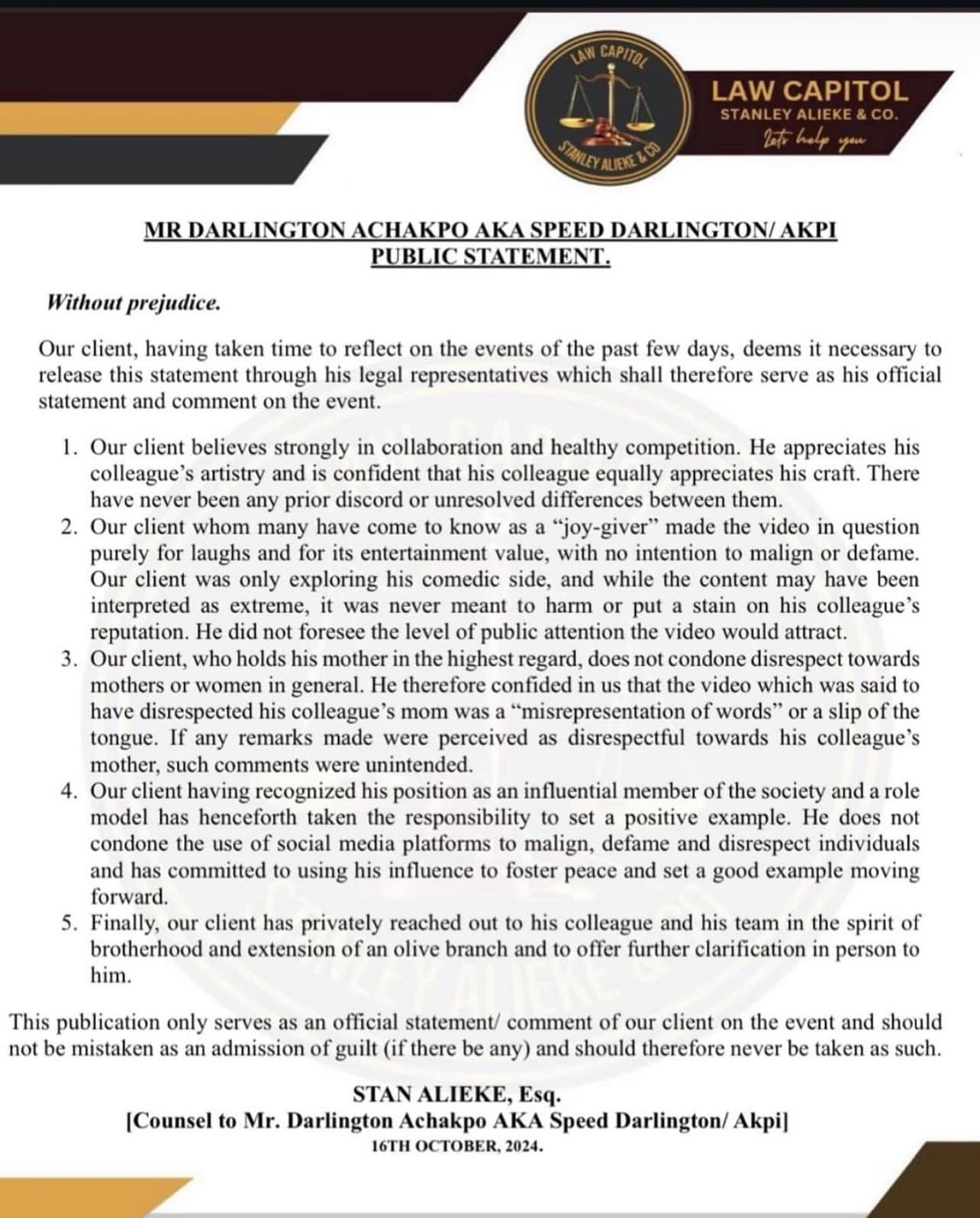 [Counsel to Mr. Darlington Achakpo AKA Speed PUBLIC STATEMENT.
