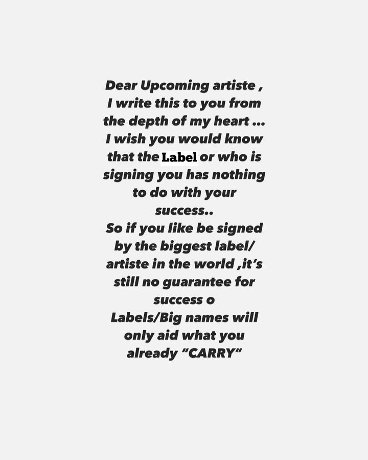 His words in part: “Dear Upcoming artiste, I write this to you from the depth of my heart… I wish you would know that the Label or who is signing you has nothing to do with your success.. So if you like be signed by the biggest label/ artiste in the world,it’s still no guarantee for success o Labels/Big names will only aid what you already “CARRY”