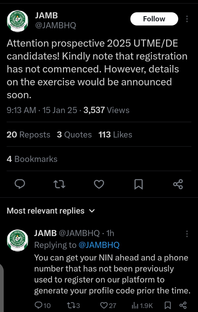 JAMB also advised prospective candidates to begin preparations by securing their National Identification Number and a unique phone number.