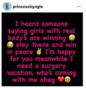 Princess Shyngle who stated that girls with their natural bodies can stay winning in peace, added that she needs a surgery vacation.