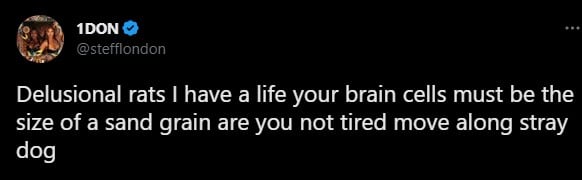 “Delusional rats I have a life your brain cells must be the size of a sand grain are you not tired move along stray dog,” she stated unapologetically.