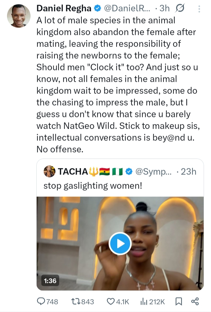 “A lot of male species in the animal kingdom also abandon the female after mating, leaving the responsibility of raising the newborns to the female; Should men “Clock it” too? And just so u know, not all females in the animal kingdom wait to be impressed, some do the chasing to impress the male, but I guess u don’t know that since u barely watch NatGeo Wild. Stick to makeup sis, intellectual conversations is bey@nd u. No offense.”