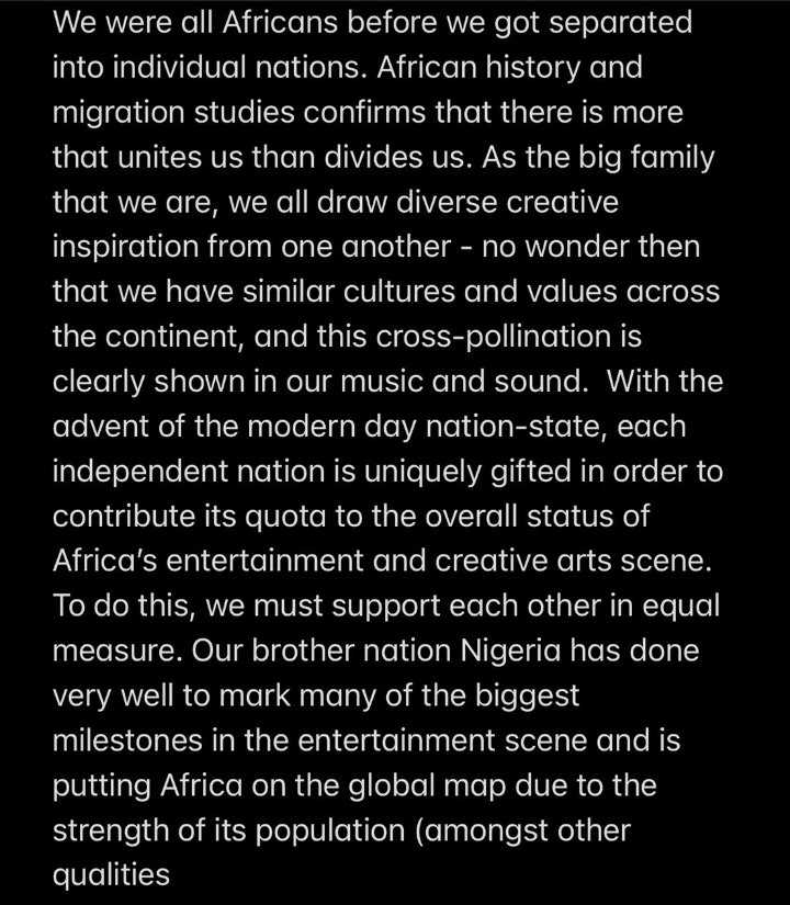 He wrote, “We were all Africans before we got separated into individual nations. African history and migration studies confirms that there is more that unites us than divides us. As the big family that we are, we all draw diverse creative inspiration from one another – no wonder then that we have similar cultures and values across the continent, and this cross-pollination is clearly shown in our music and sound.
