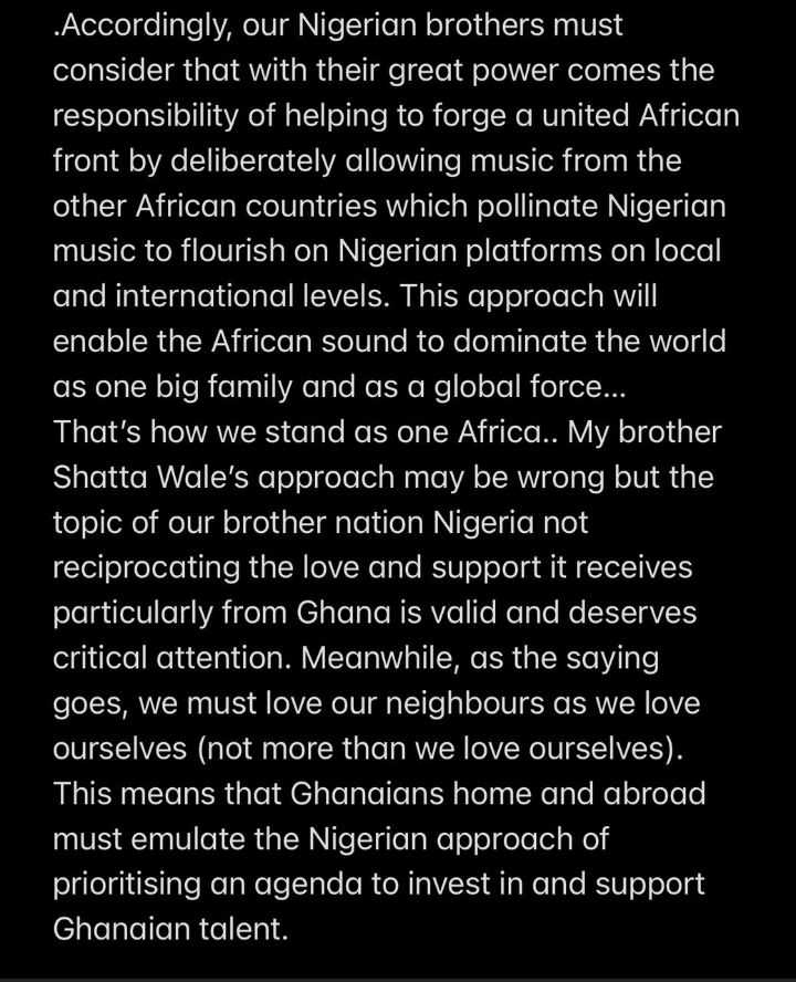 “Accordingly, our Nigerian brothers must consider that with their great power comes the responsibility of helping to forge a united African front by deliberately allowing music from the other African countries which pollinate Nigerian music to flourish on Nigerian platforms on local and international levels. This approach will enable the African sound to dominate the world as one big family and as a global force… That’s how we stand as one Africa.. My brother Shatta Wale’s approach may be wrong but the topic of our brother nation Nigeria not reciprocating the love and support it receives particularly from Ghana is valid and deserves critical attention. Meanwhile, as the saying goes, we must love our neighbours as we love ourselves (not more than we love ourselves). This means that Ghanaians home and abroad must emulate the Nigerian approach of prioritising an agenda to invest in and support Ghanaian talent.”