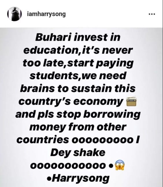 In an Instagram post shared hours after Buhari’s request for 850billion Naira loan was approved by the Senate, Harrysong advised the president to invest in education.