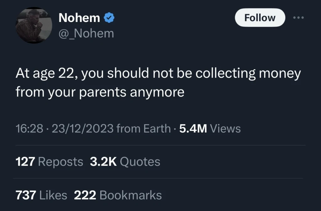 “Stop collecting money from your parents once you turn 22” — Man tells Netizens