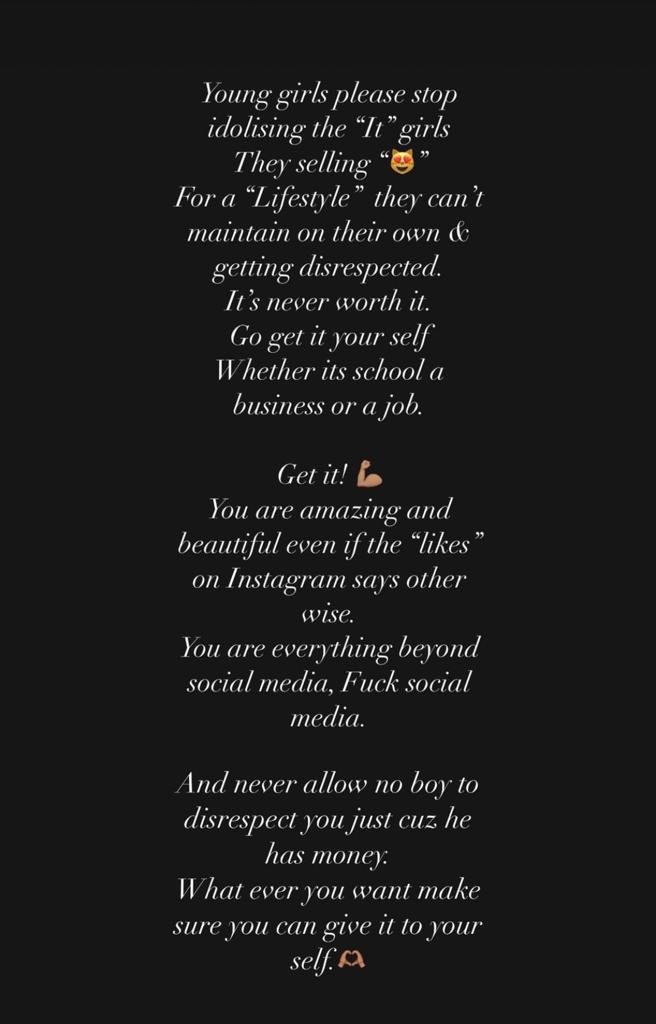 “Young girls please stop idolizing the “It” girls They selling “pussy cat emoji” For a “Lifestyle” they can’t maintain on their own & getting disrespected. It’s never worth it. Go get it your self Whether its school a business or a job.