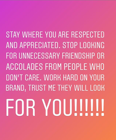 “STAY WHERE YOU ARE RESPECTED AND APPRECIATED. STOP LOOKING FOR UNNECESSARY FRIENDSHIP OR ACCOLADES FROM PEOPLE WHO DON’T CARE. WORK HARD ON YOUR BRAND, TRUST ME THEY WILL LOOK FOR YOU!!!!”