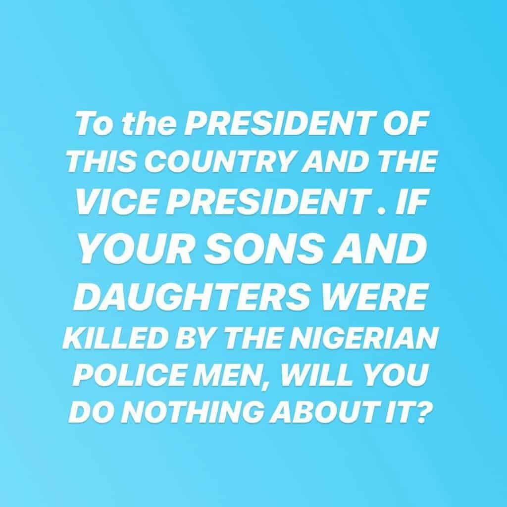 ” EVEN THOUGH MY parents don’t want me to do this, To be honest….it is Painful that this keeps happening and nothing is done to these officers…..LIVES OF PEOPLE MEANS NOTHING TO YOU cos they ain’t your kids?……if na even the President, no Wahala but VICE PRESIDENT SIR, you are a good Christian and a Pastor at least that title “Pastor” was used during this last election, I saw the billboards . Our LIVES MATTER. it can be your Turn Tomorrow!!!!!. It can be your turn tomorrow. We are not animals…..It’s getting worse everyday and it’s unbearable….IT CAN BE YOUR TURN TOMORROW. Even the so called POLICE ambassadors are doing great job than the PRESIDENT AND THE VICE PRESIDENT….do the right thing cos it can be your turn tomorrow.? @muhammadubuhari @profosinbajo.”