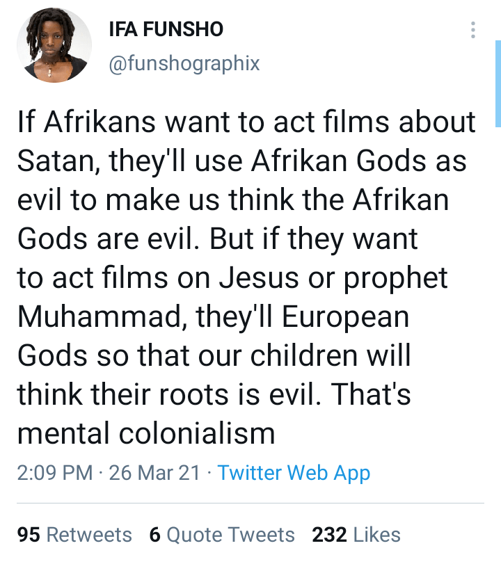 “If Afrikans want to act films about Satan, they’ll use Afrikan Gods as evil to make us think the Afrikan Gods are evil. But if they want to act films on Jesus or prophet Muhammad, they’ll European Gods so that our children will think their roots is evil. That’s mental colonialism.”