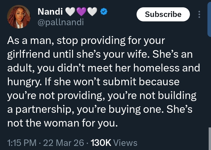 Nandi wrote: “As a man, stop providing for your girlfriend until she’s your wife. She’s an adult, you didn’t meet her homeless and hungry. If she won’t submit because you’re not providing, you’re not building a partnership, you’re buying one. She’s not the woman for you.”