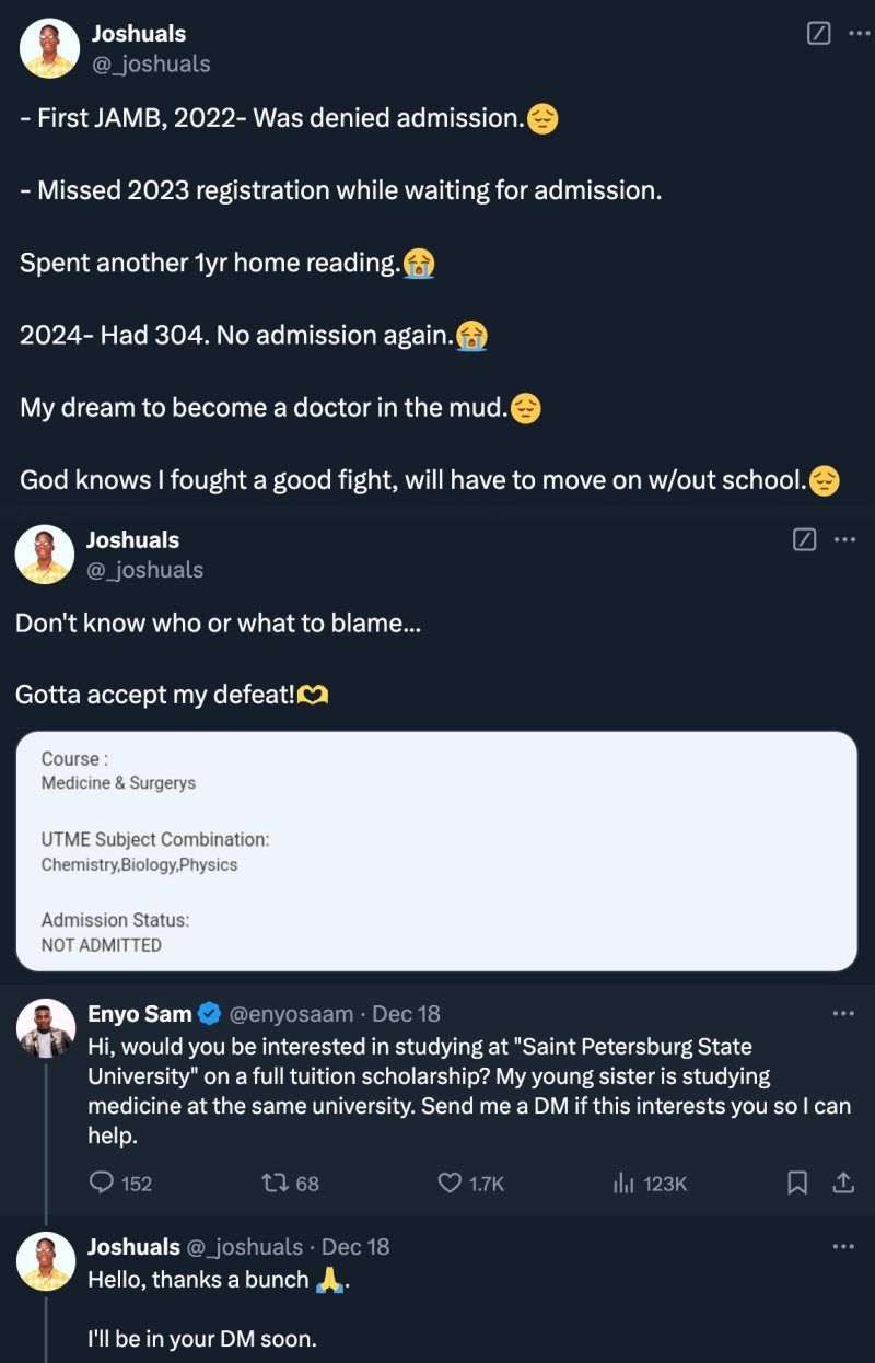 The student, known as @_joshuals on X (formerly Twitter), had taken to the platform to express his frustration after failing to secure university admission.