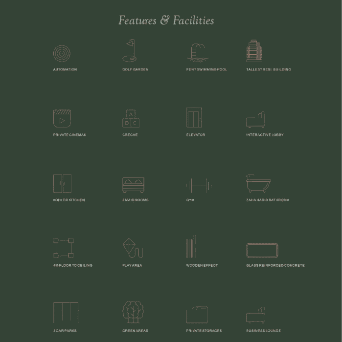 First building in Nigeria with a Glass Reinforced Concrete (GRC) facade, home to Africa’s 1st interactive lobby, private saloon, a crèche equipped with a governess to help raise future leaders, a vast Private pool which gives a scenic view of the exclusive Island’s landscape, first Virtual Golf Bar with over 2500 courses; first building to deploy the Rolls Royce of door automation technology – Oikos Doors, first building with an International SPA that pampers your indulgence for the residents; first building with Zaha Hadid sanitary ware by Porcelanosa and Kohler Kitchen, the first building with a 120-inch screen IMAX cinema for an immersive experience; the first building in Nigeria with Crestron Automation where you can easily command, monitor and adjust your lights, shades, thermostats, door locks, entertainment and even your pool and spa from just one app, and now the first ever residential building in Africa to feature 20 Tesla charging stations.
