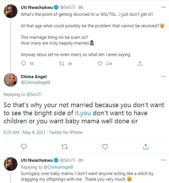 “Surrogacy over baby mama. I don’t want anyone acting like a witch by dragging my offsprings with me. Thank you very much”